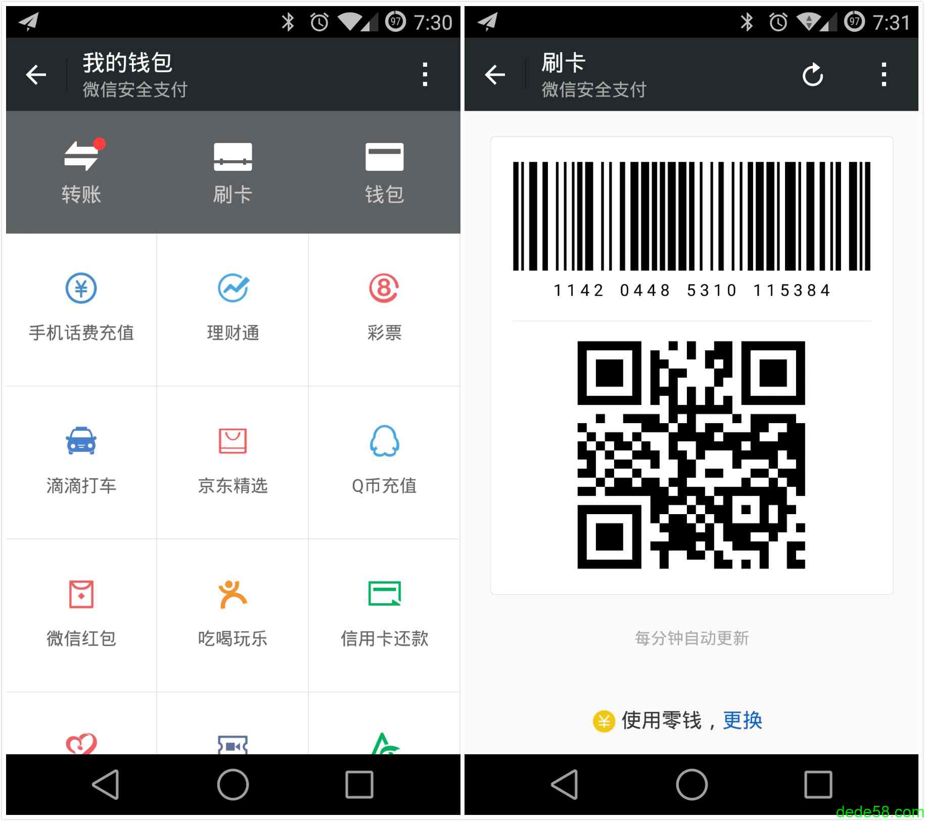 开启之后刷卡功能会以每分钟自动更新的条形码和二维码的方式展现,从而同时支持用户选择使用自己的微信钱包的余额,或者注册到该账户下的所有银行卡进行支付,理论上讲在线下零售商进行扫码支付前用户应该进行选择。而每分钟自动更新的条形码和二维码则为支付功能带来了一层额外的安全。